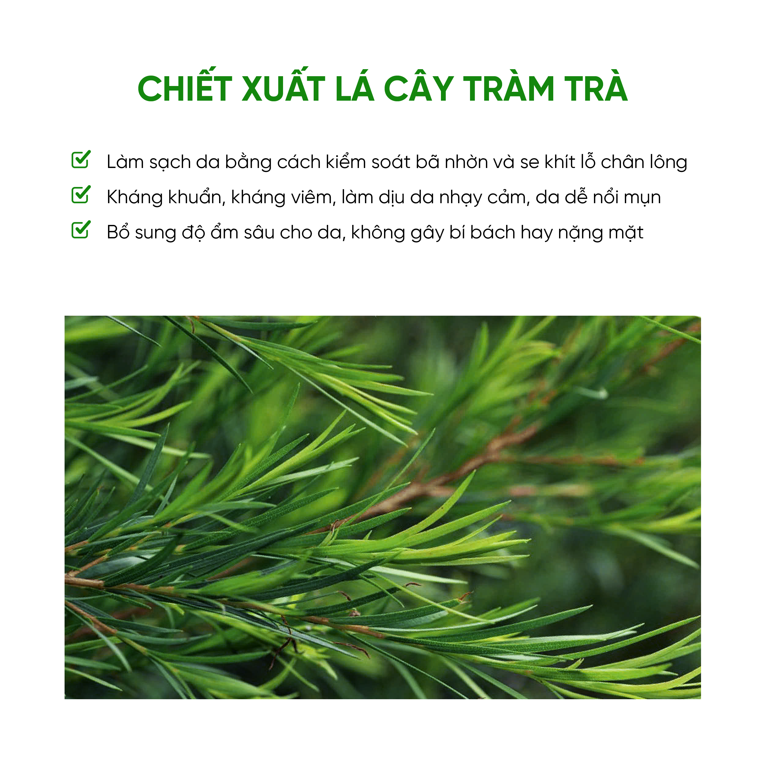 – Chiết xuất lá cây tràm trà kiểm soát bã nhờn, kháng khuẩn, kháng viêm, làm dịu da nhạy cảm, da dễ nổi mụn và se khít lỗ chân lông